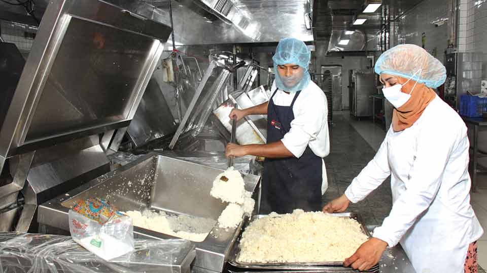 Chefs and staff at BFCC kitchen preparing rice for in-flight meals