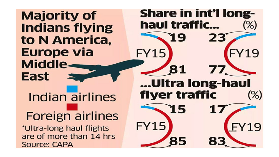 In FY20, 69pc of Indian passengers flying to Europe and North America travelled through hubs such as Dubai, Abu Dhabi and Doha on foreign airlines.