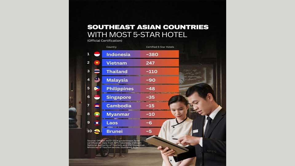 Dhaka: Indonesia leads Southeast Asia in the number of officially certified five-star hotels, with about 380 luxury properties spread across the archipelago, underscoring the strength of its tourism sector.
