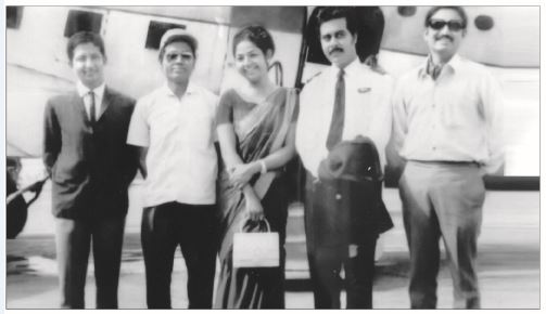 Historical photo of then Captain Alamgir Sattar, Captain Khaleq, Air Hostess Mina Chowdhury, Flight Purser Suja Khandakar, and Captain Abdul Mukit in front of DC-3, the first plane of Biman in 1972