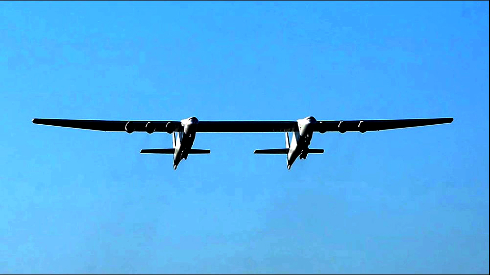 The Stratolaunch -- code name "Roc" -- is the largest plane ever built. Its wings measure 385 feet across, longer than a professional football field. The Stratolaunch is powered by six 250 kN (56,000 lbf) Pratt & Whitney PW4056 engines harvested from the Boeing 747-400s.