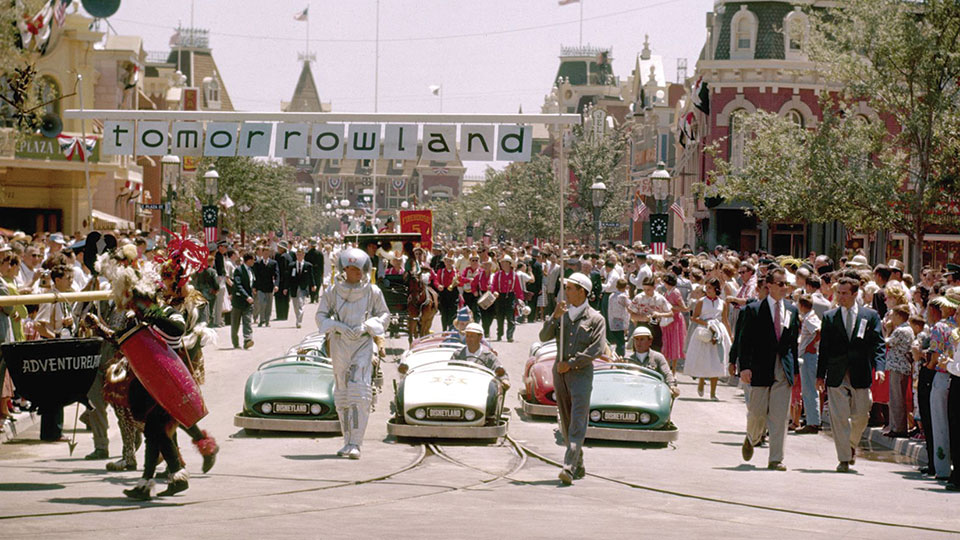 Crowd watching parade marching through the Tomorrowland portion-futuristic part of the park-on the opening day in 1955